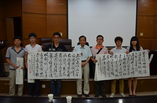 台教授与大家一起品读《陶铸传》,评析陶铸诗词,让我们重温了陶铸先生鞠躬尽瘁、全心全意为人民服务的一生。他勉励师生继续追求“树木树人”的精神真谛。讲座结束后,台教授向听众赠送了以陶铸诗词为主要内容的书法作品。